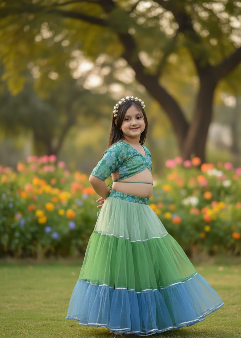 Rock the party with our Green Multi colored Lehenga set! Made from net and silk materials, this designer lehenga set is perfect for your little girl's night functions. Get ready to be the center of attention with this exclusive piece!
