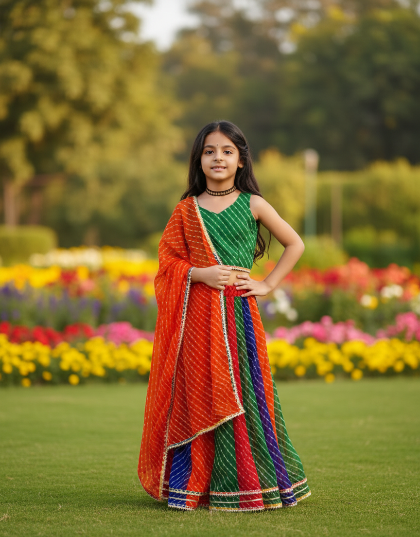 Elevate your little one's style with our Green Georgette Pachrangi Lehenga Set! This vibrant, multicolor lehenga set is perfect for any occasion. Made with high quality georgette fabric, it offers both comfort and style. Complete with a designer blouse, this traditional outfit will surely impress.