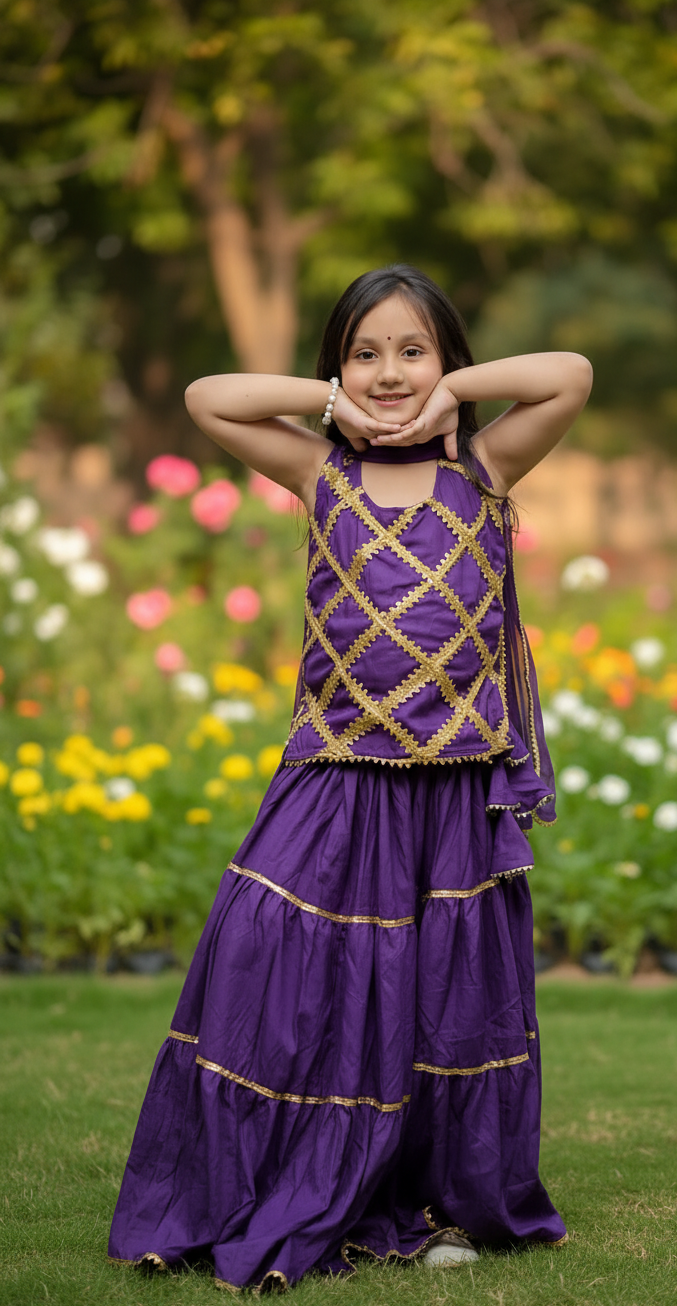 Unleash your little girl's desi swag with the Purple Kurti Lehenga set! Made from comfortable rayon, this ethnic set features a short kurti and full Punjabi style lehenga, perfect for any festive occasion. Give her a trendy ethnic wear with a touch of tradition!