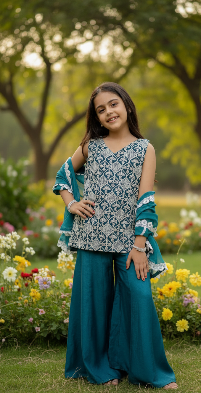 Elevate your little one's style with our Kurta Palazzo Dupatta Set! Perfect for Day wedding functions, a beautiful Rama Green color with White Embroidered Designer Short Kurta with Flared Palazzo and Soft Semi Chiffon dupatta with Lace work with comfort and style at single space. It can make a statement and add a touch of tradition to any event.