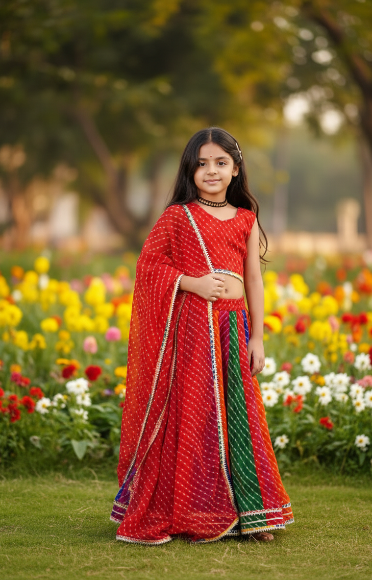 Elevate your little one's style with our Red Georgette Pachrangi Lehenga Set! This vibrant, multicolor lehenga set is perfect for any occasion. Made with high quality georgette fabric, it offers both comfort and style. Complete with a designer blouse, this traditional outfit will surely impress.