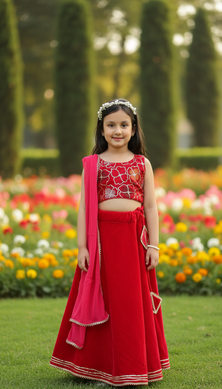 Elevate your little girl's look with our Rani Pink Velvet Lehenga set! Made with the best quality velvet and a designer velvet blouse, The lehenga is lined with cotton and features a can-can for an extra Flared Look.