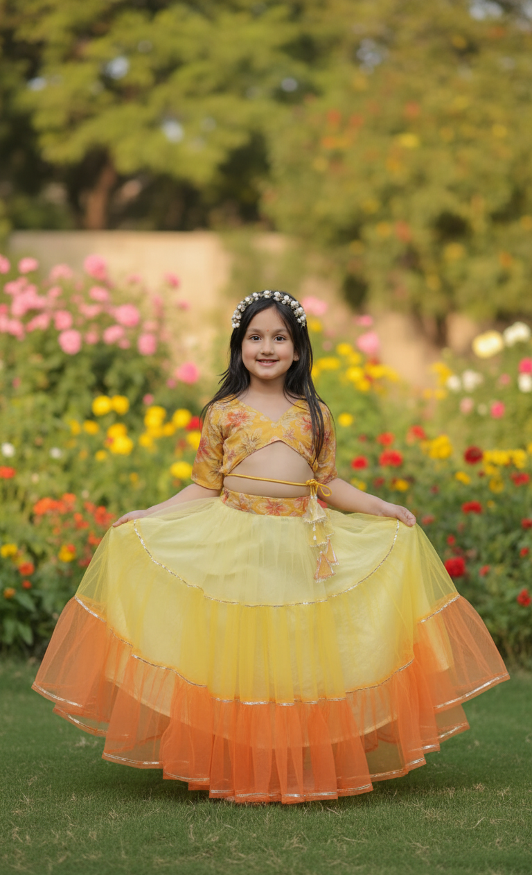 Rock the party with our Yellow Multi colored Lehenga set! Made from net and silk materials, this designer lehenga set is perfect for your little girl's night functions. Get ready to be the center of attention with this exclusive piece!