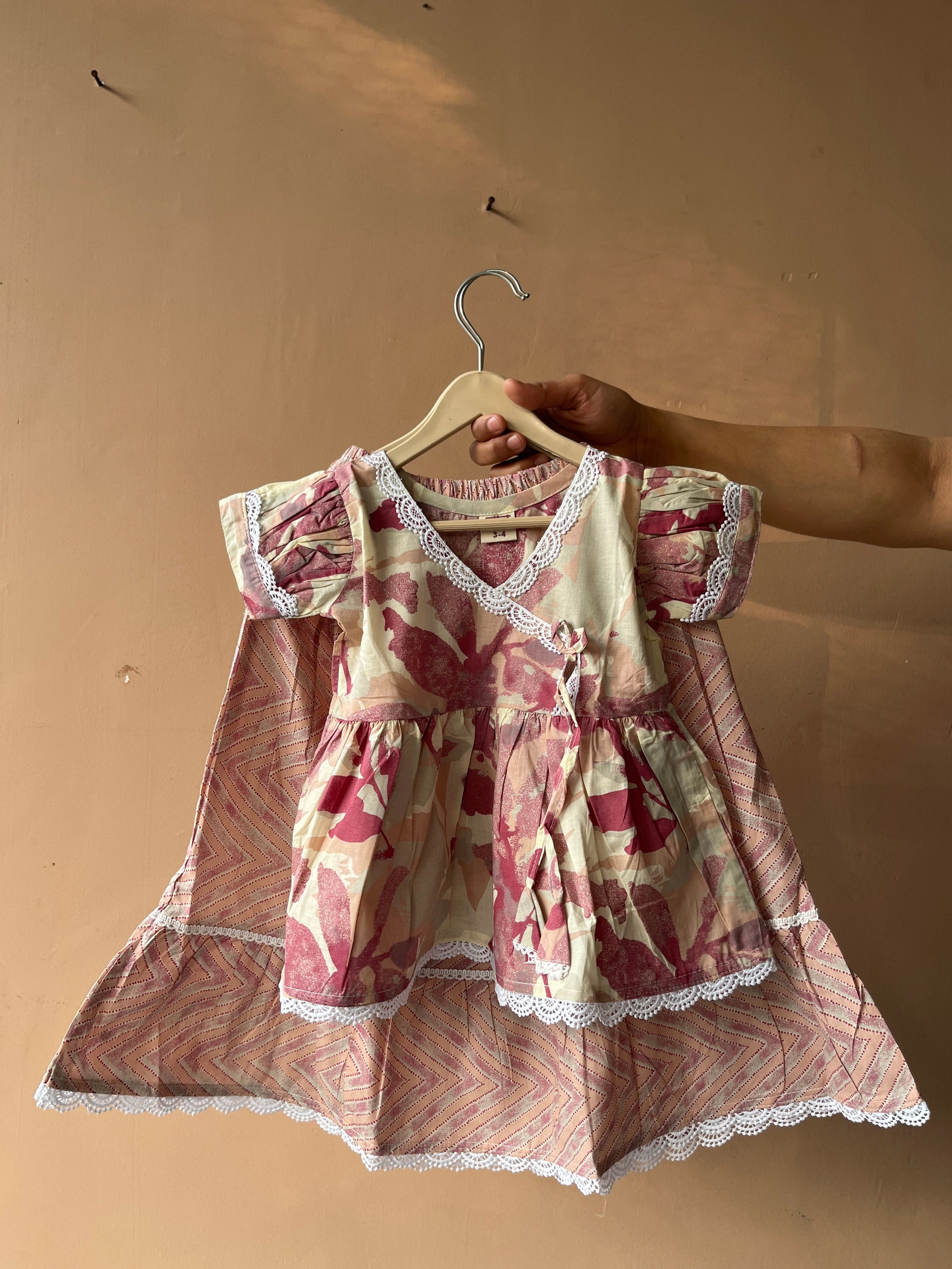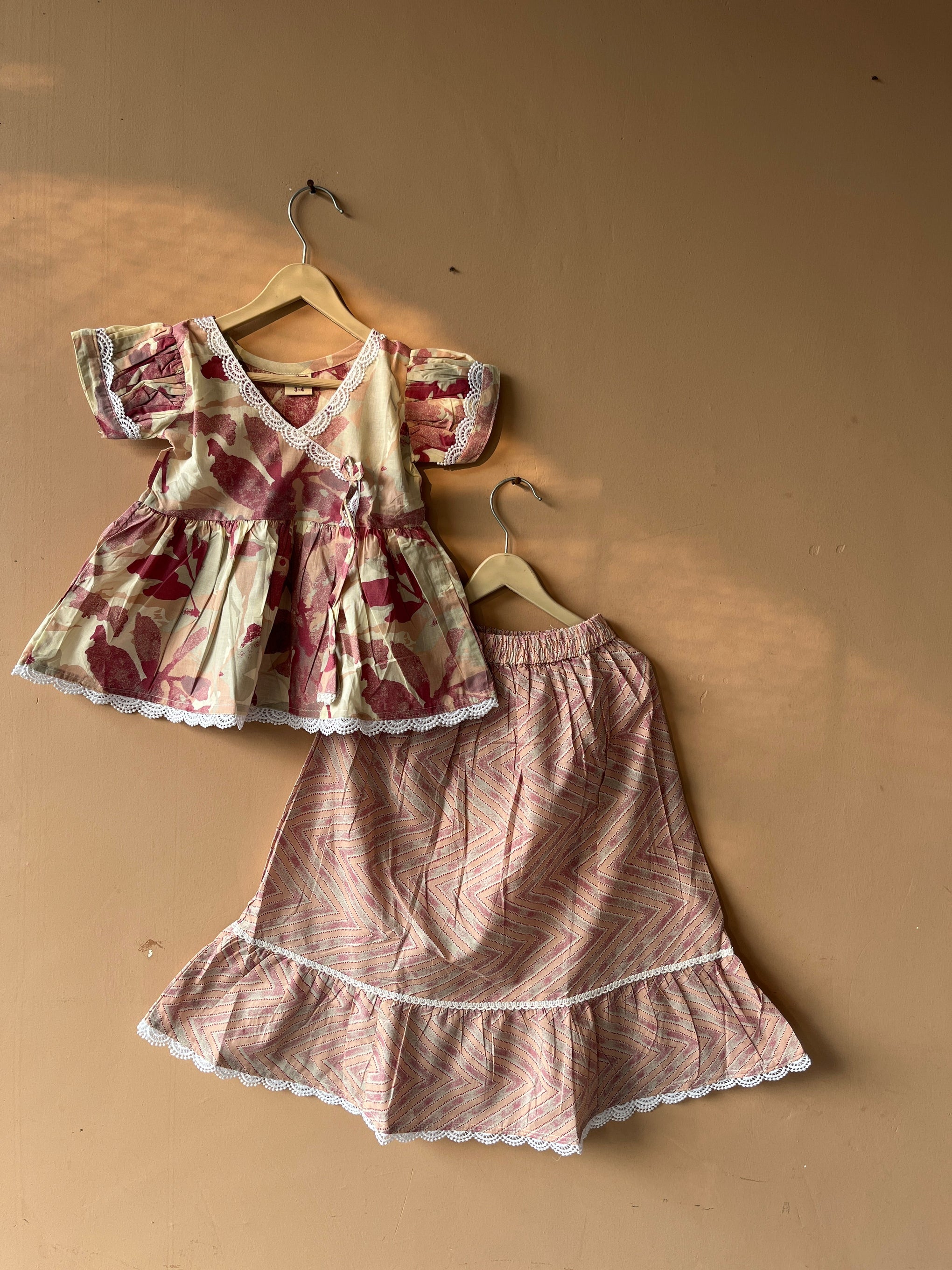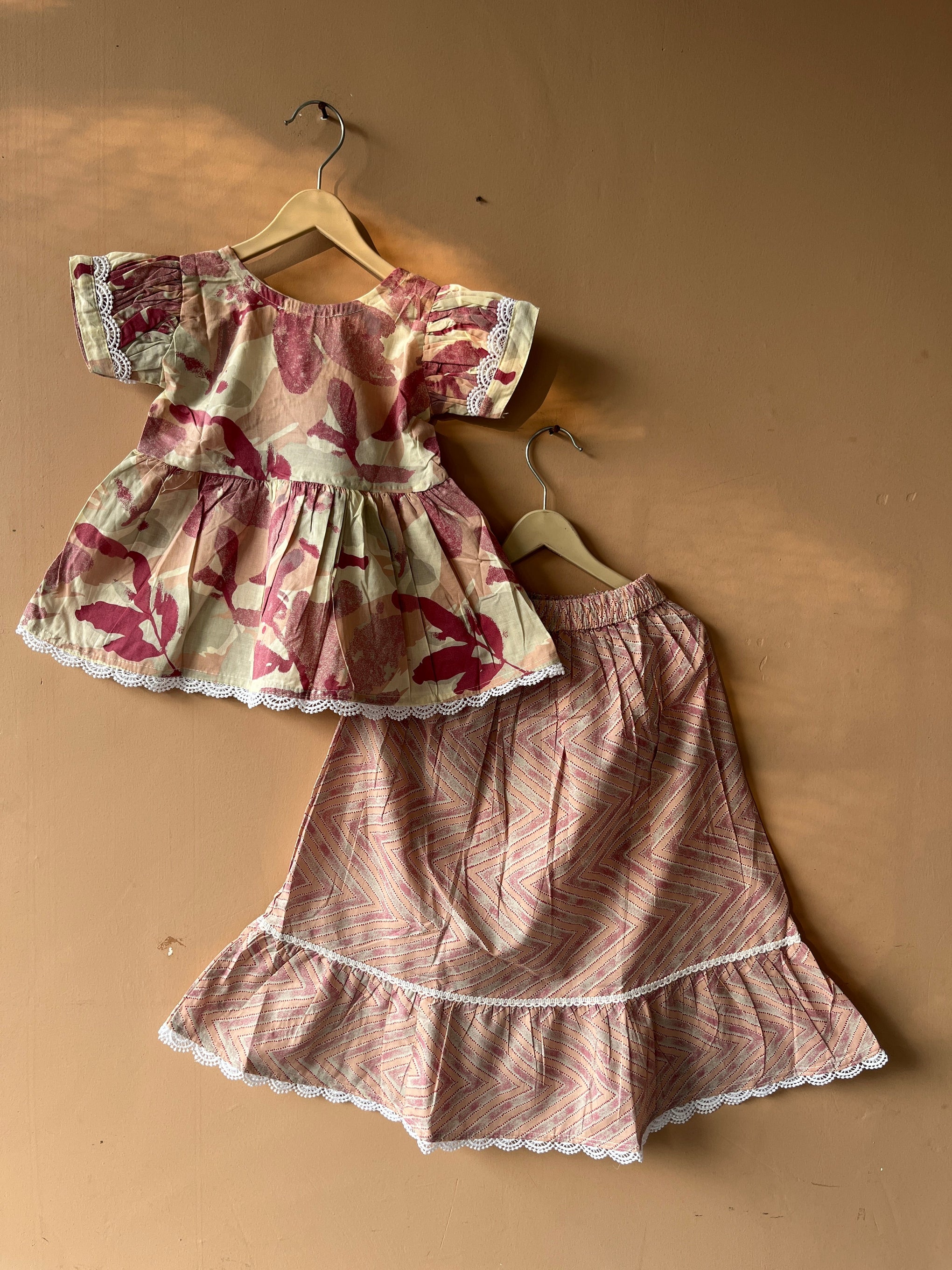 Unleash your kids playful side with this white and pink pastel peplum top and skirt set! Made of cotton this ethnic coord set exudes charm and femininity.