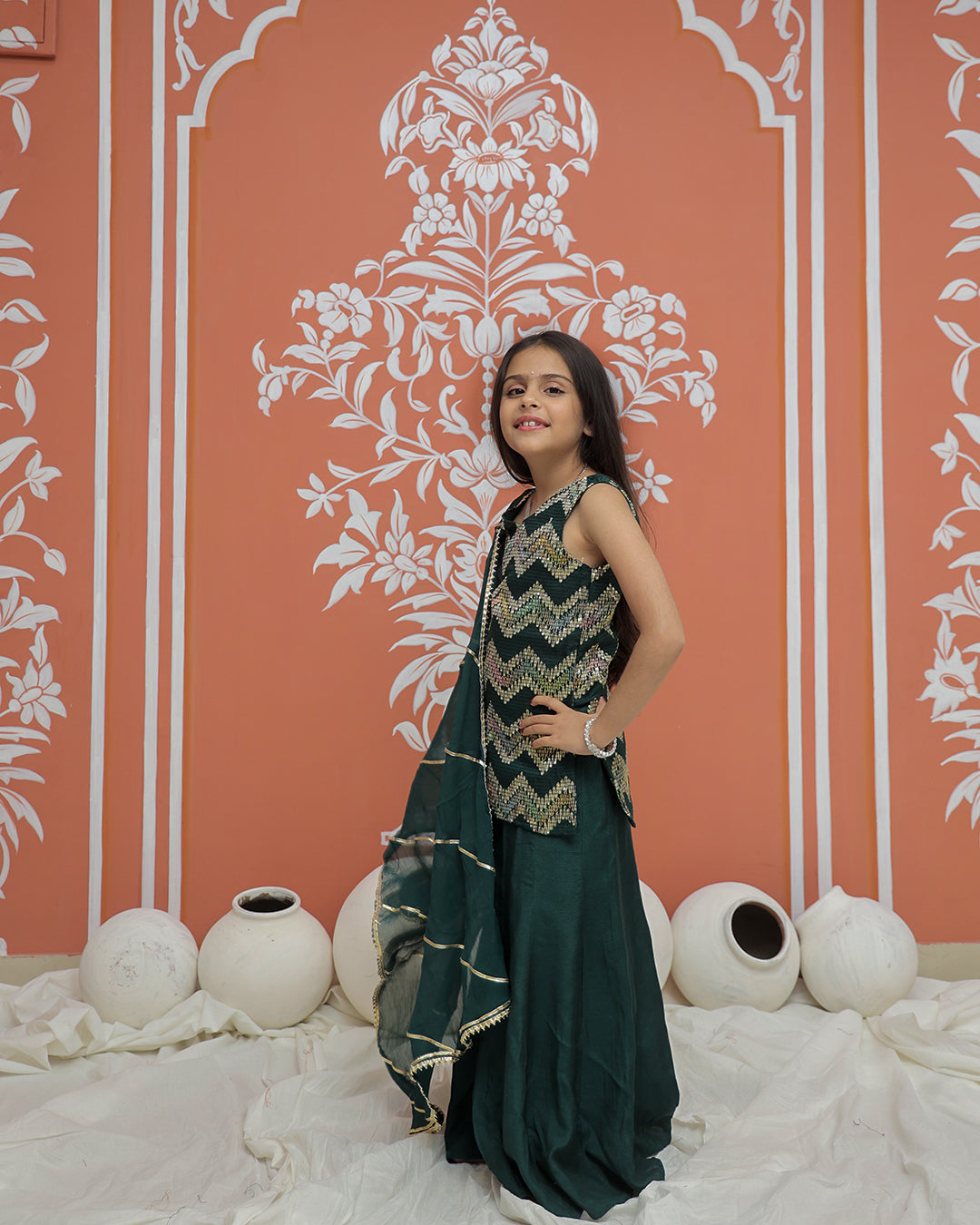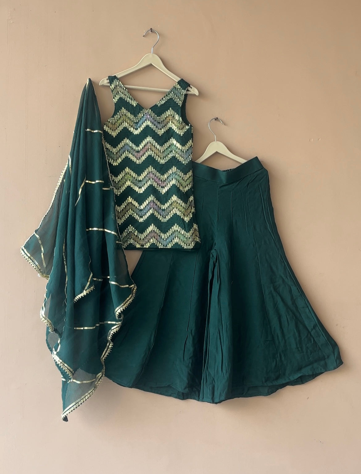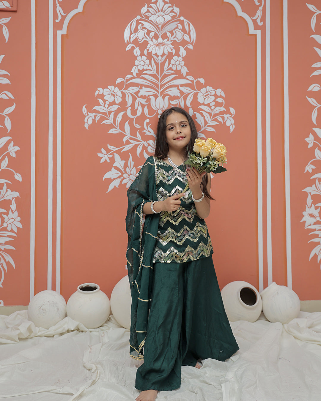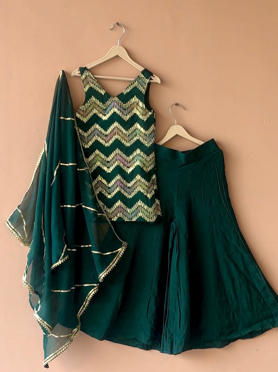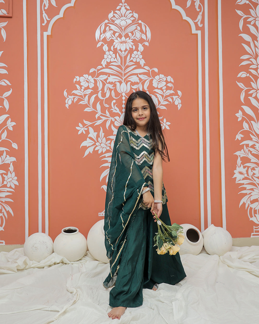 Elevate your little one's style with our Kurta Palazzo Dupatta Set! Perfect for Day wedding functions, a beautiful Green color with multicolor Gota Designer Short Kurta with Flared Palazzo and Soft Semi Chiffon dupatta with Gota work with comfort and style at single space. It can make a statement and add a touch of tradition to any event.
