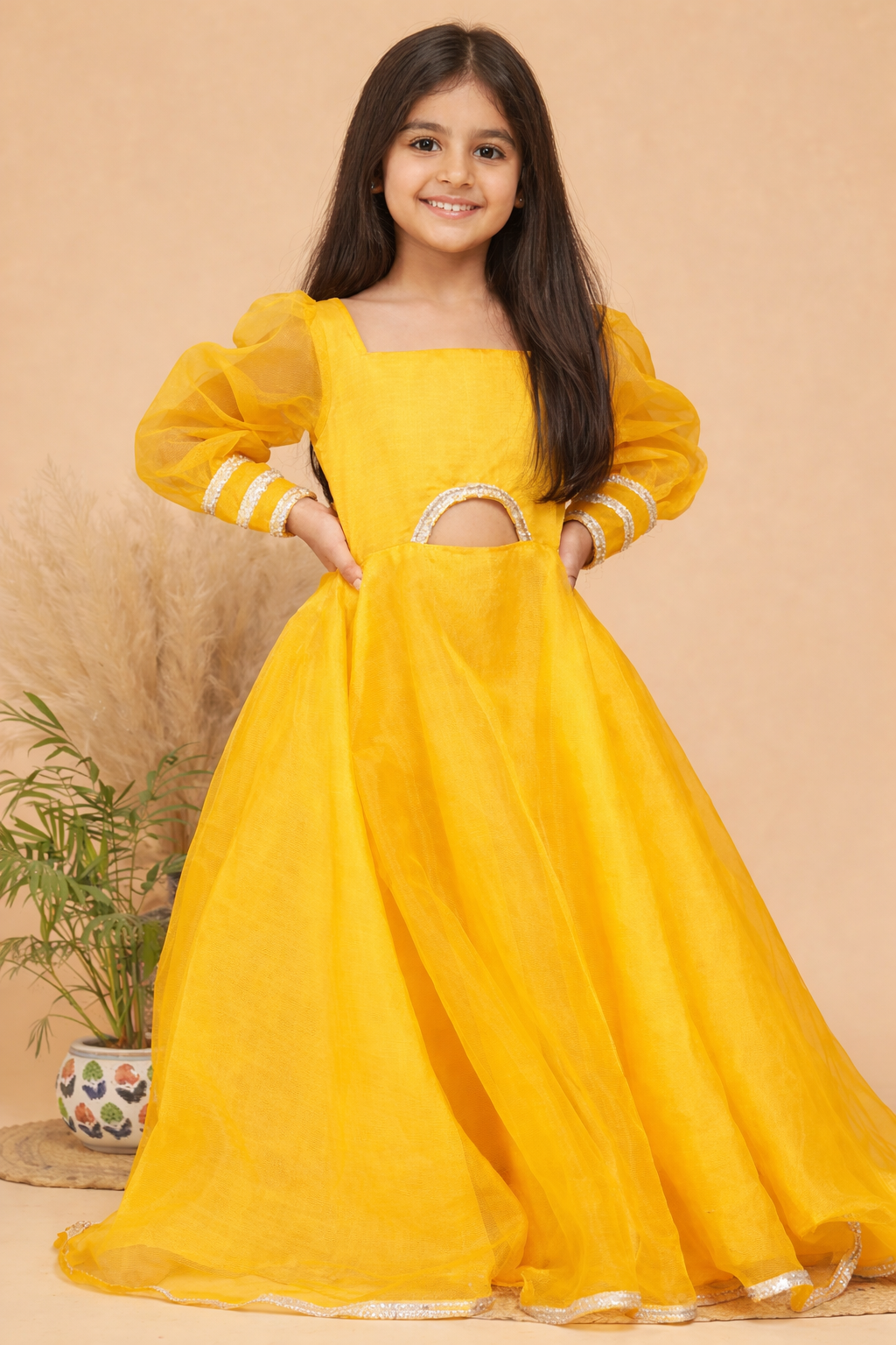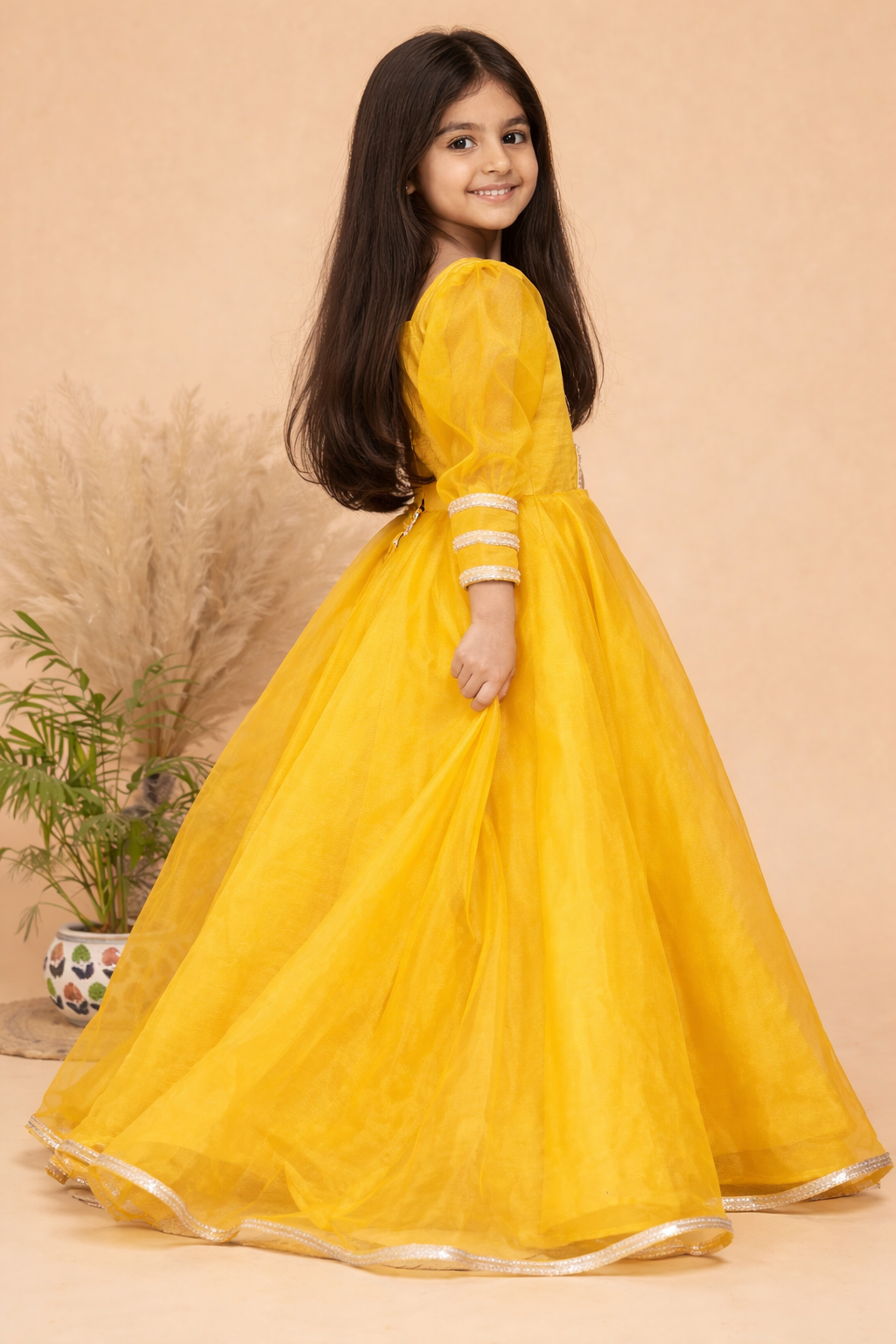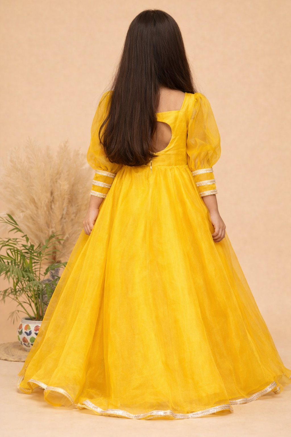 •  Bright Yellow Color Organza Flared Gown with Puff Sleeves