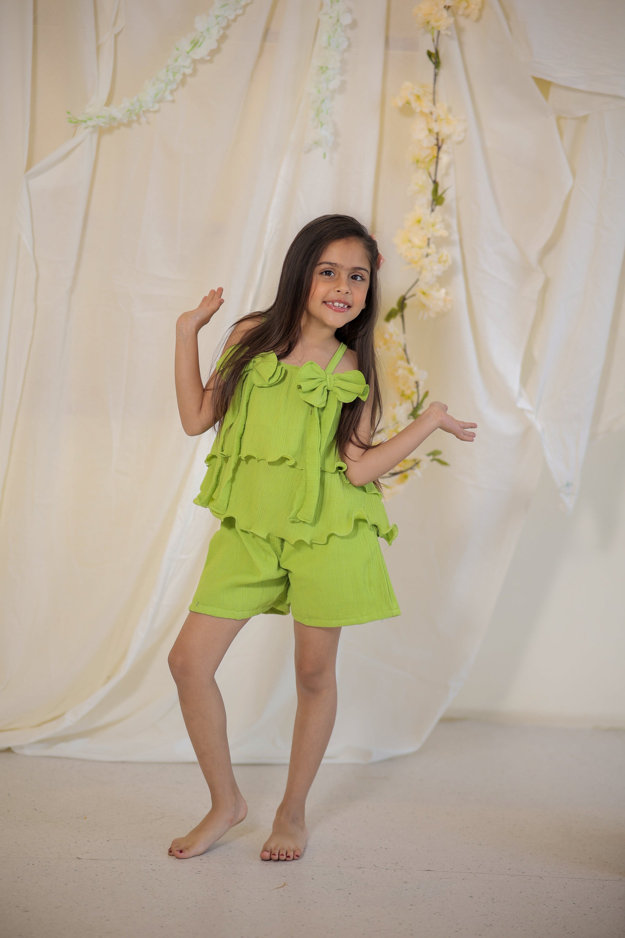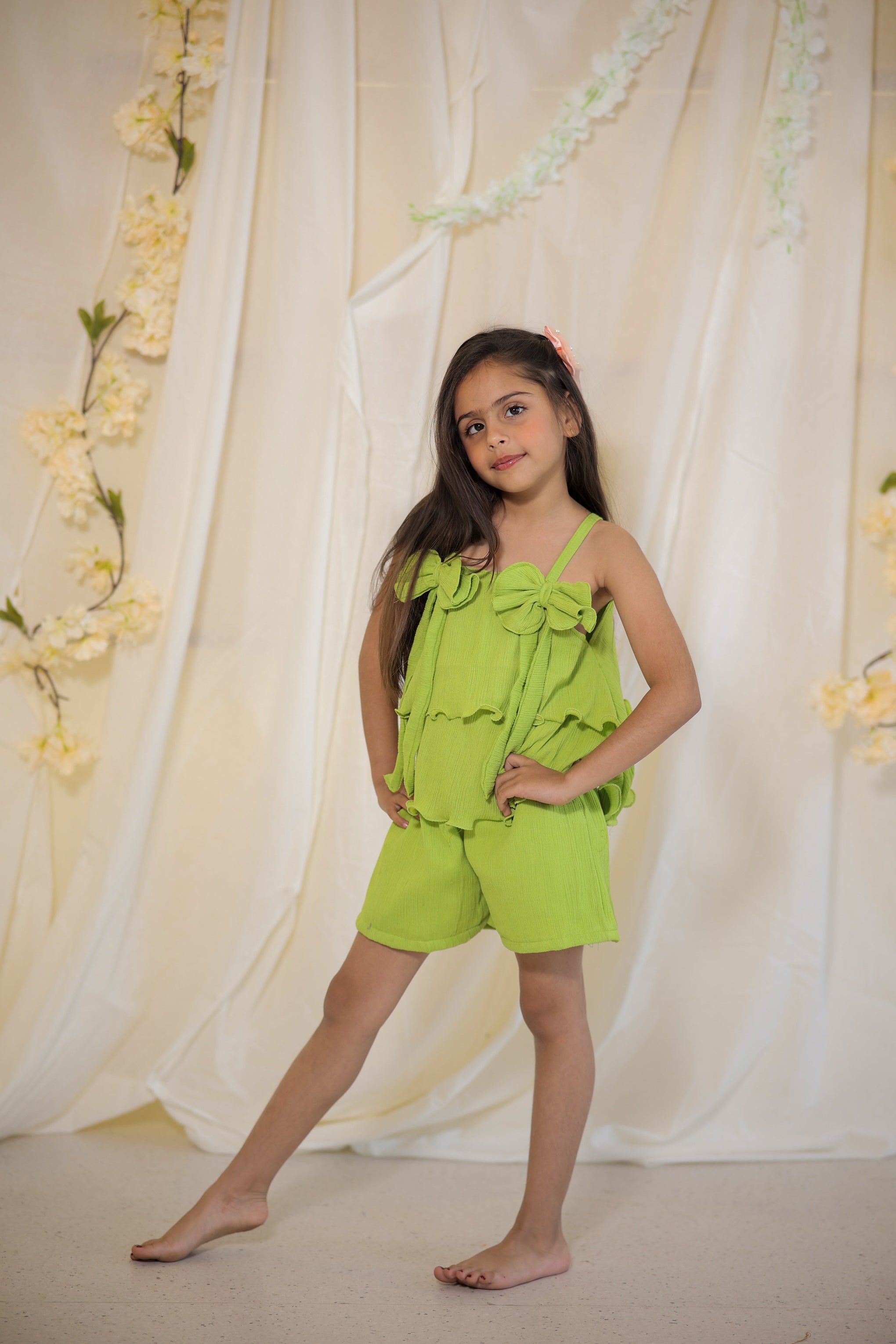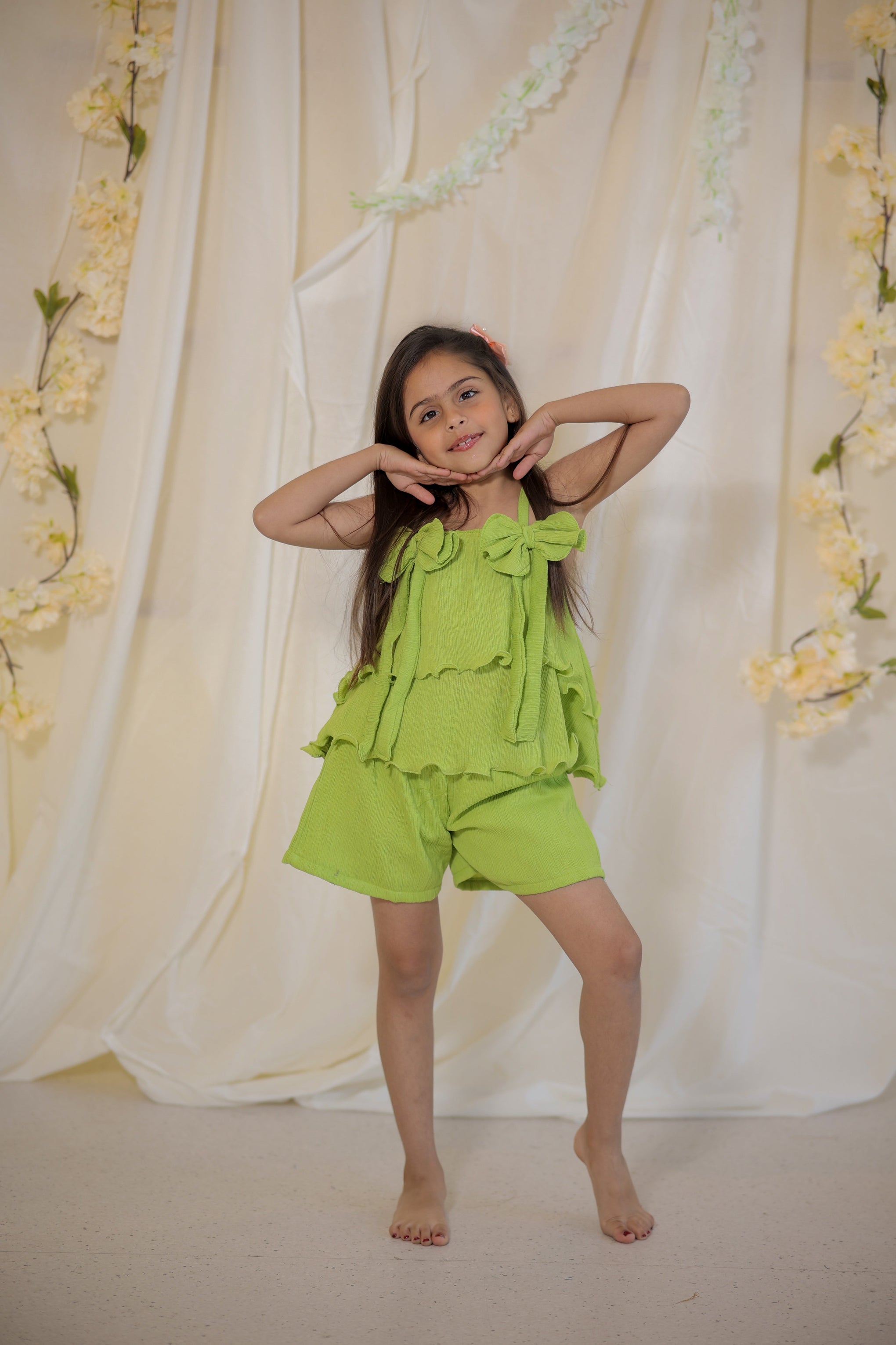 Get ready your little one for some summer fun with the Bright Green Cotton Crepe Crush Coord-set! Made from lightweight and playful cotton crepe crush fabric, this cute coord set features adorable bow ties in the front.