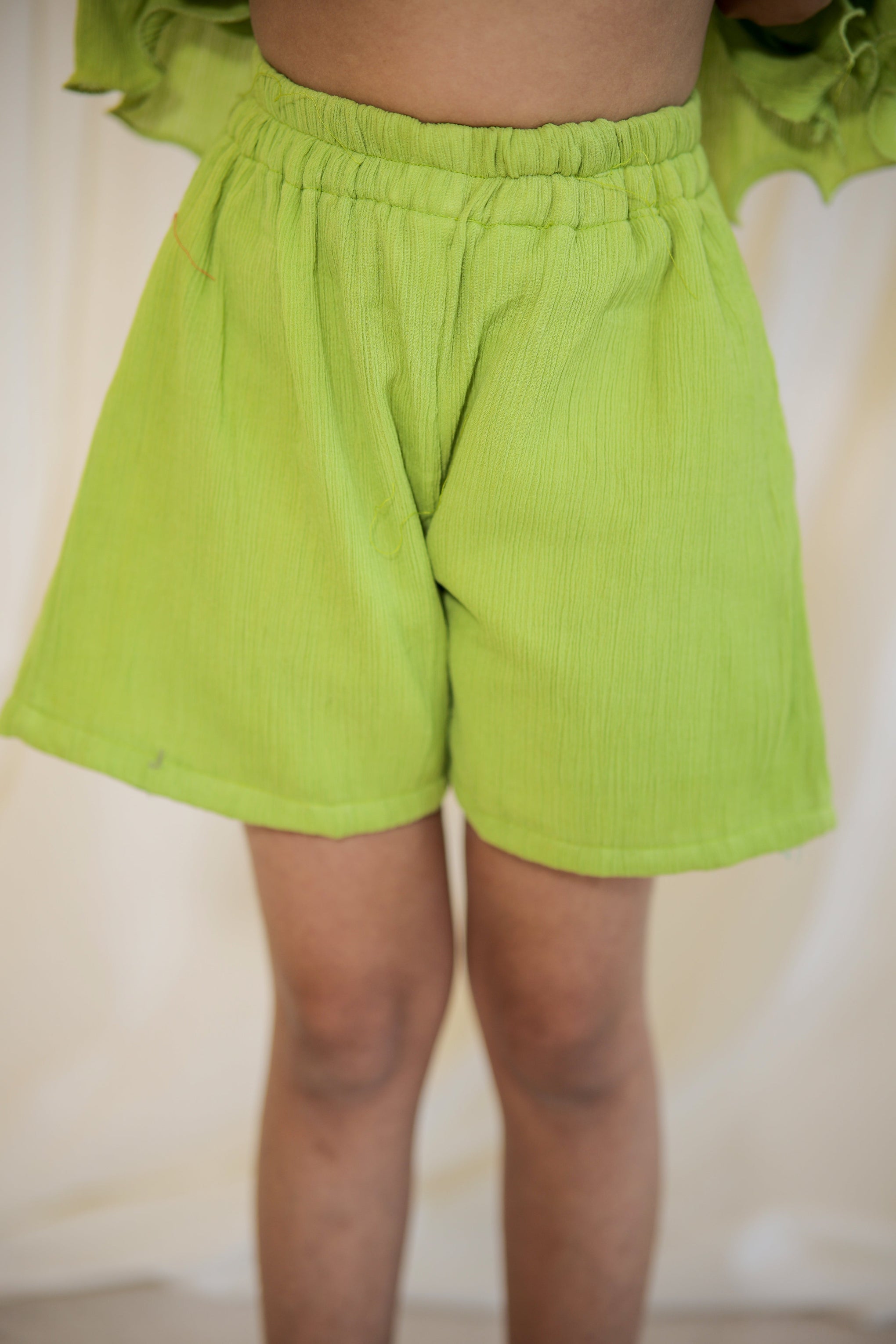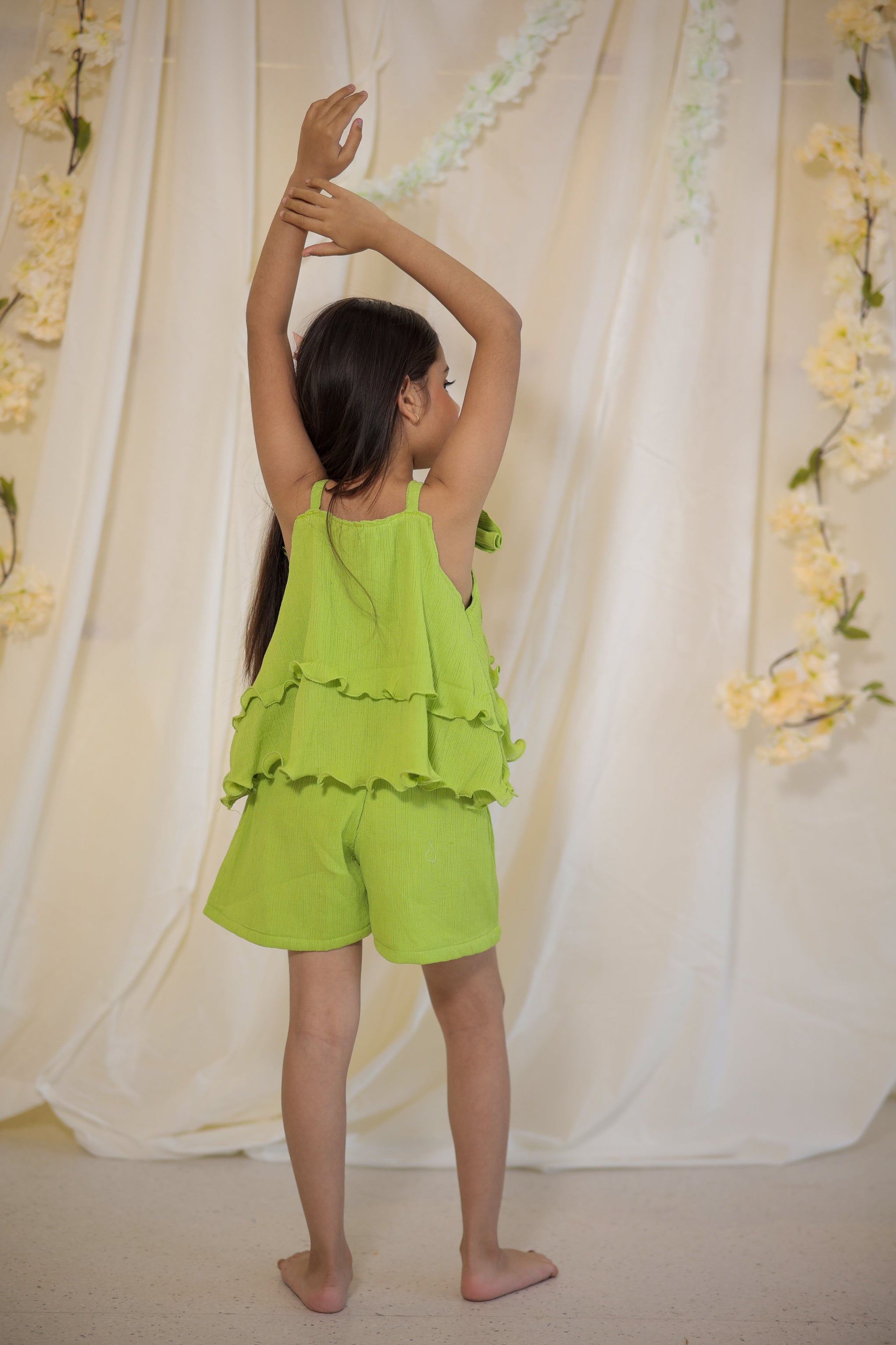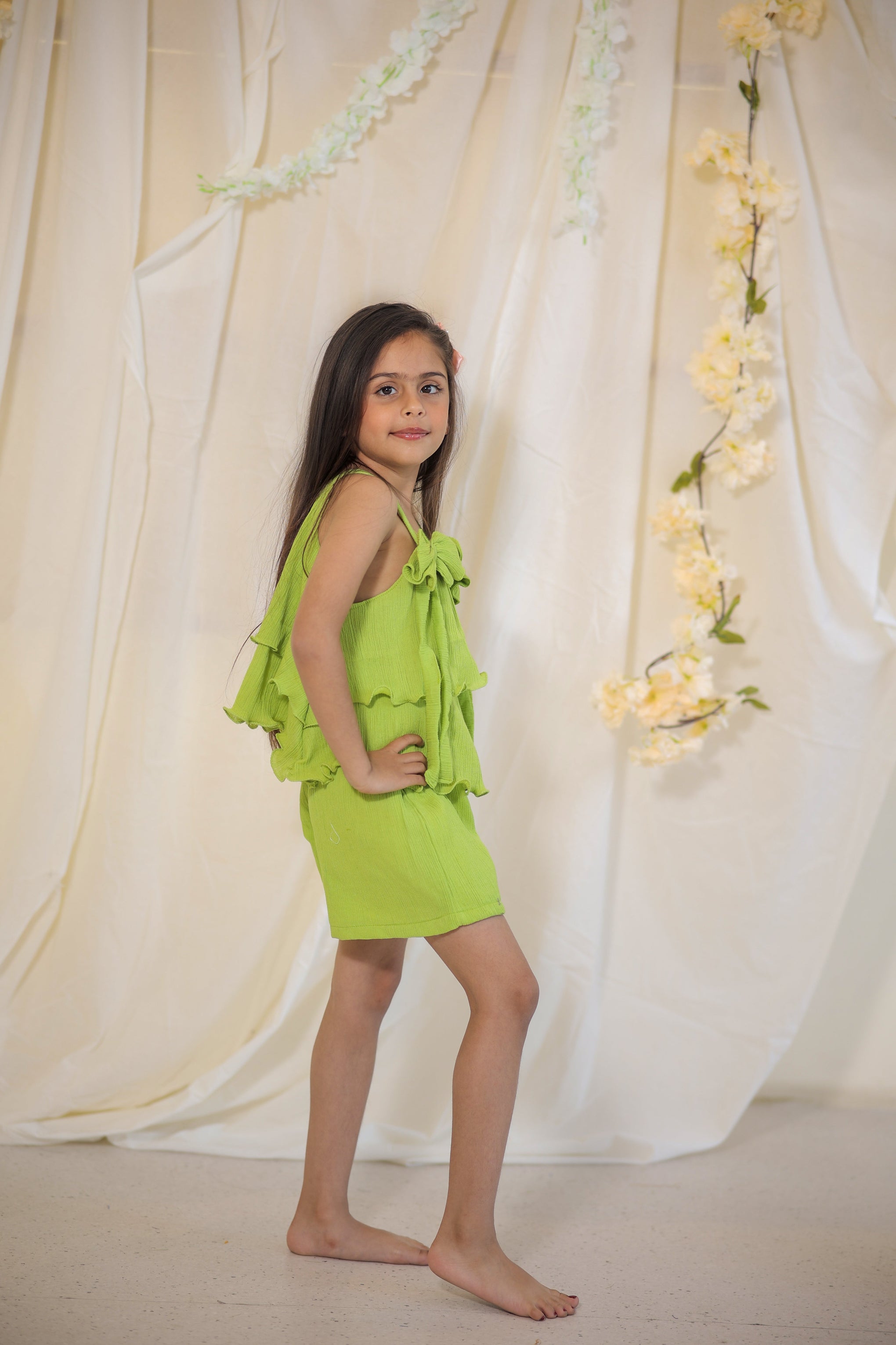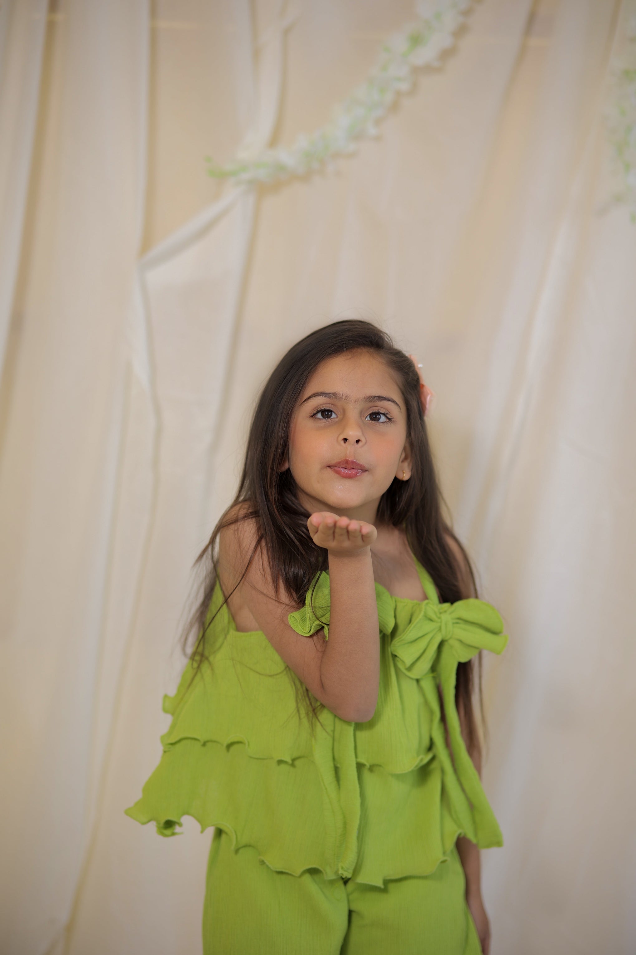 Get ready your little one for some summer fun with the Bright Green Cotton Crepe Crush Coord-set! Made from lightweight and playful cotton crepe crush fabric, this cute coord set features adorable bow ties in the front.