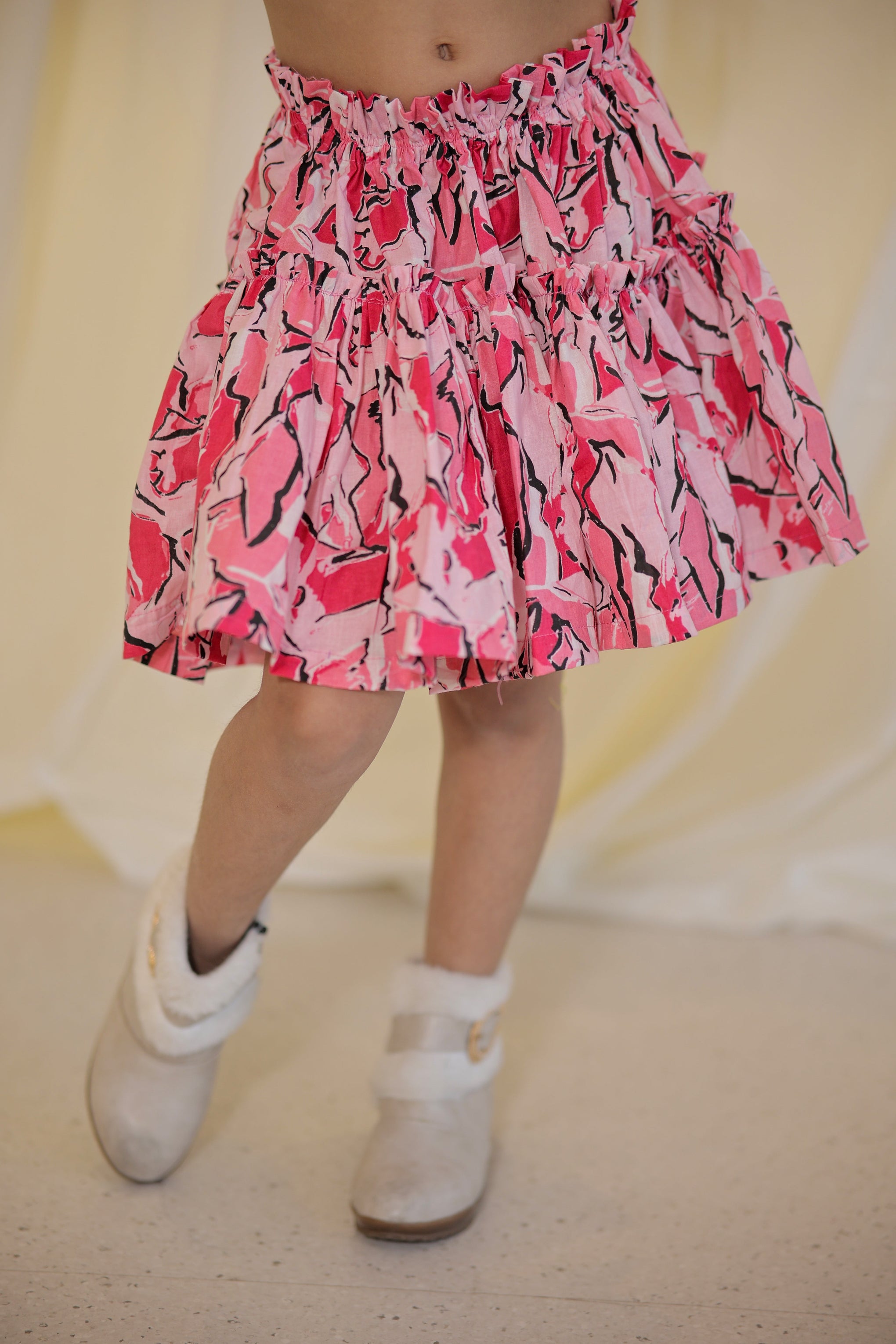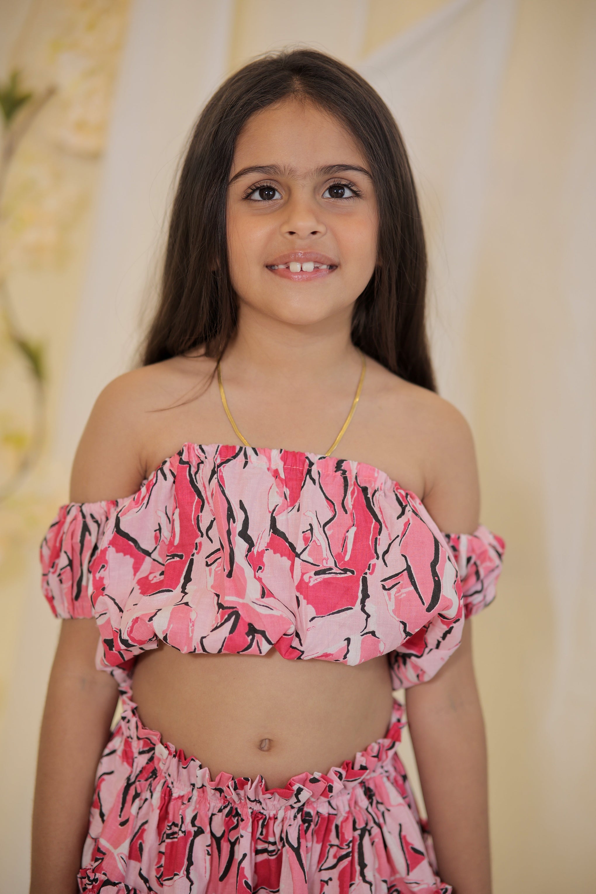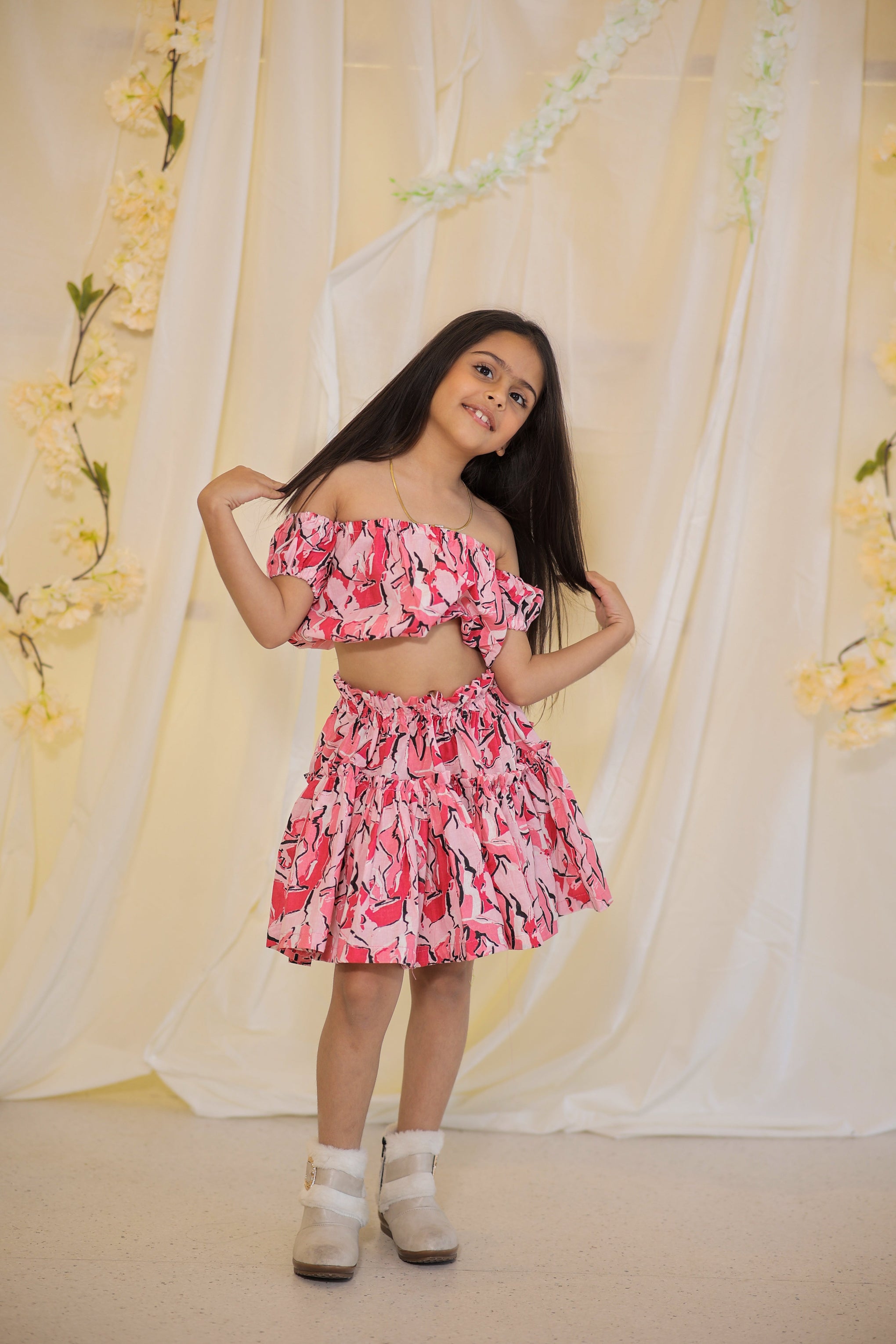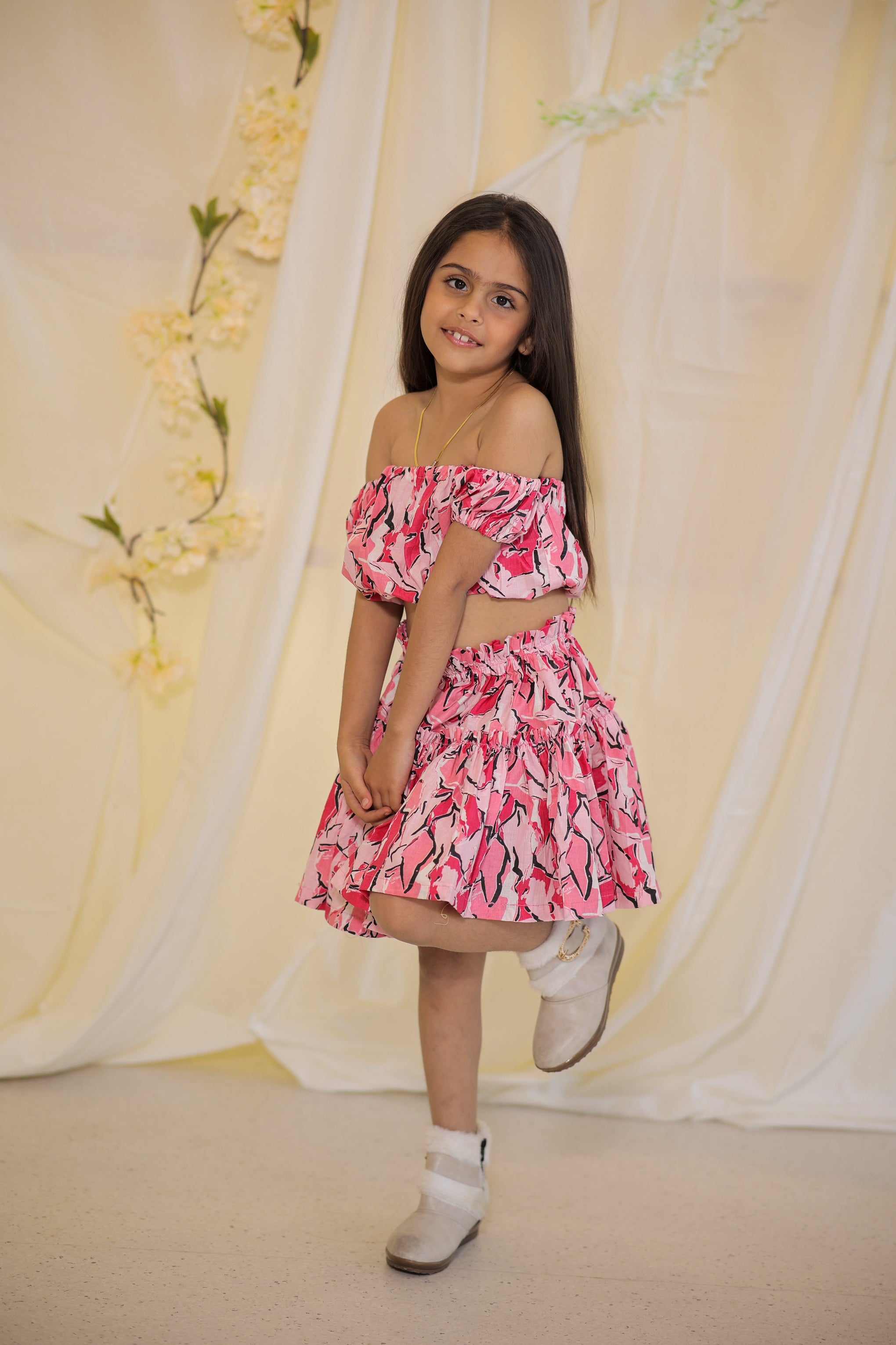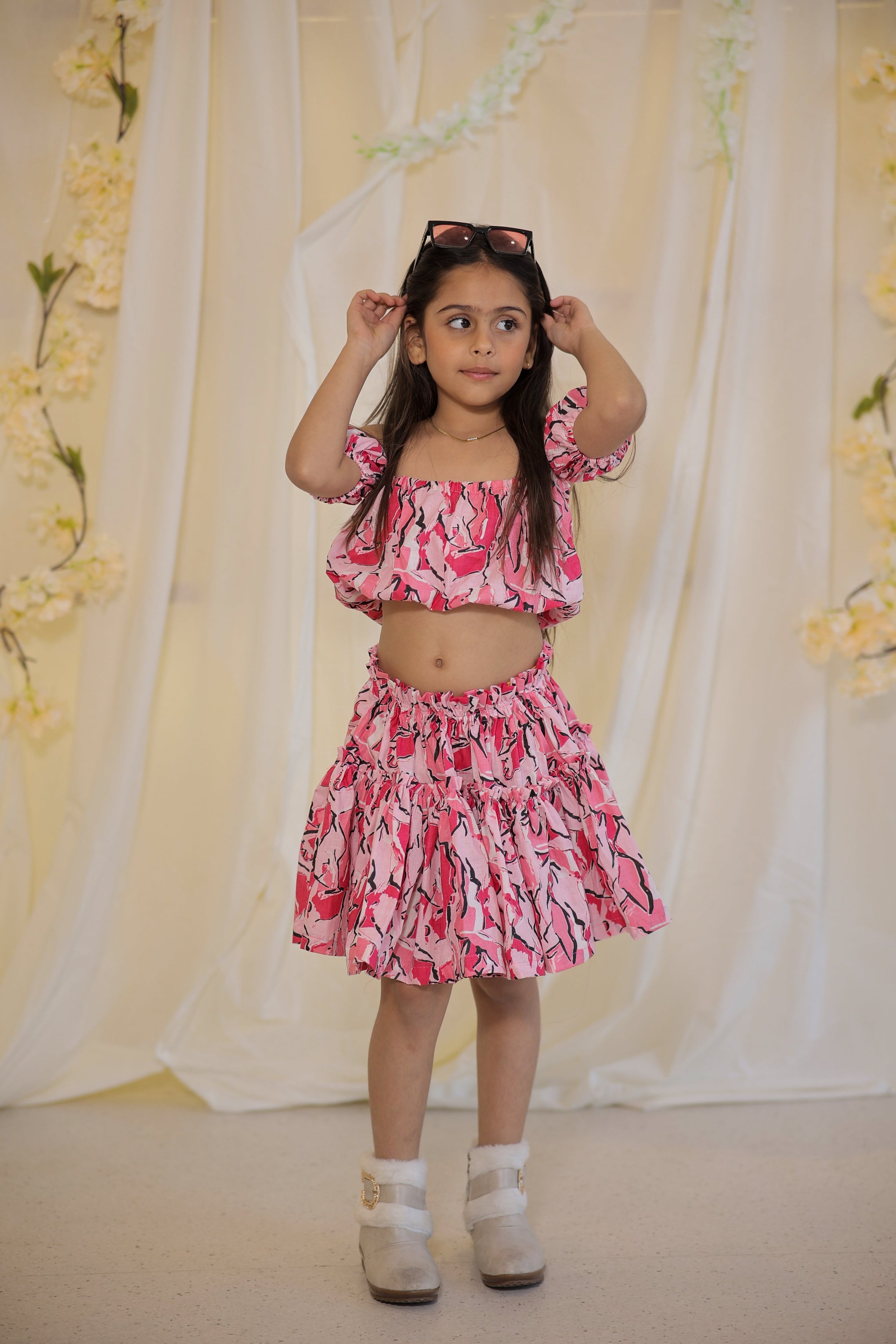 Get ready for some fashion fun with this cambric cotton Abstract Print Coord set! The trendy skirt and crop top combo features a playful abstract print, perfect for little fashionistas. It's a barbie look alike outfit that will make your little girl stand out in style!