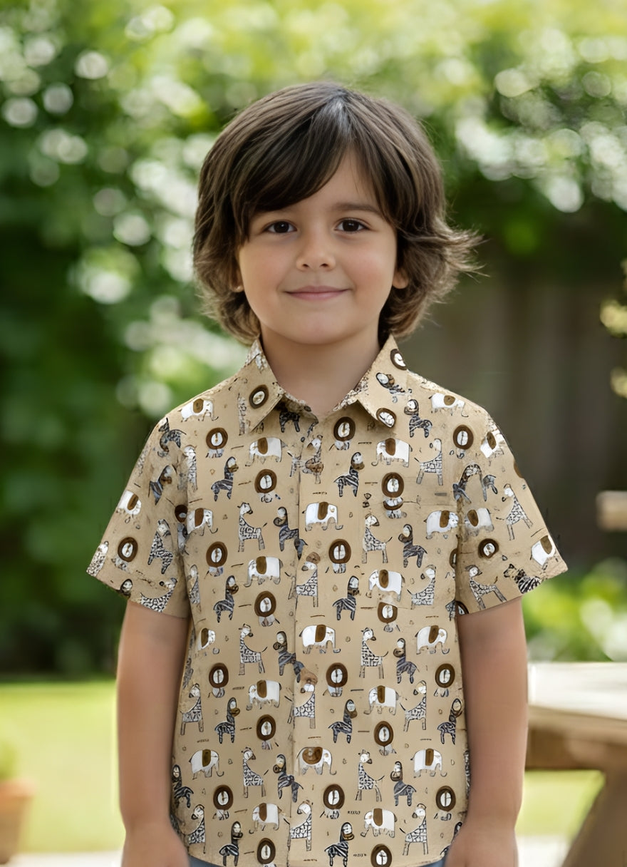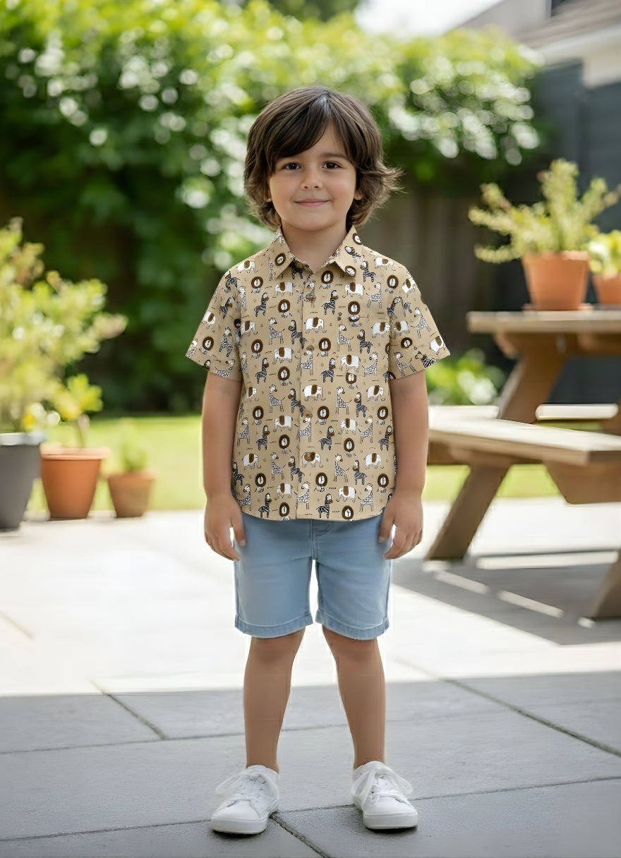 Bring a roar of style to your child’s everyday look with this beige lion print half sleeve shirt. Made from 100% pure cotton, this shirt is soft, breathable, and gentle on kids’ skin, ensuring all-day comfort. The cute animal (lion) print adds a fun and playful vibe, while the classic regular fit keeps the look neat and comfortable. Perfect for casual outings, playtime, or day-to-day wear, this shirt blends comfort with charming style.