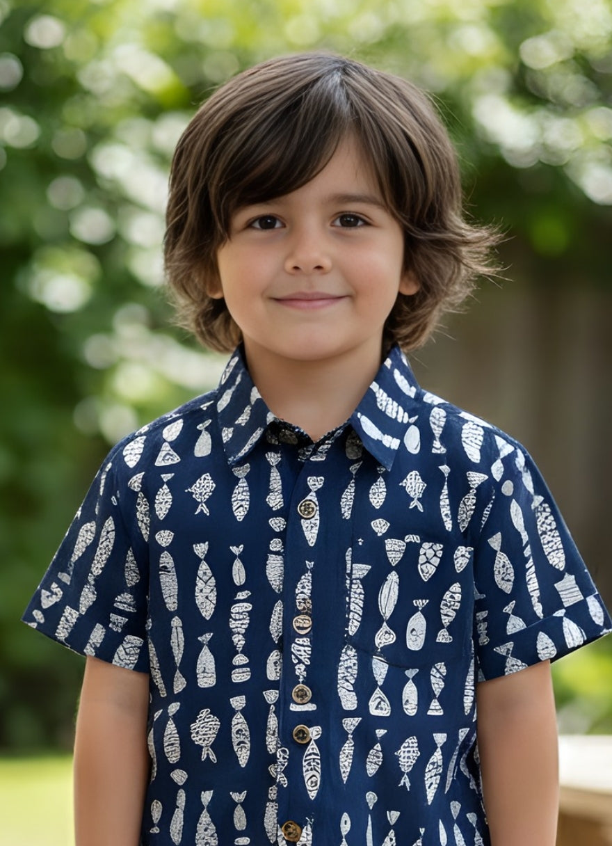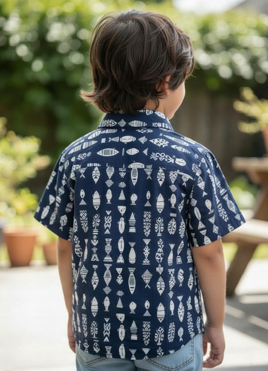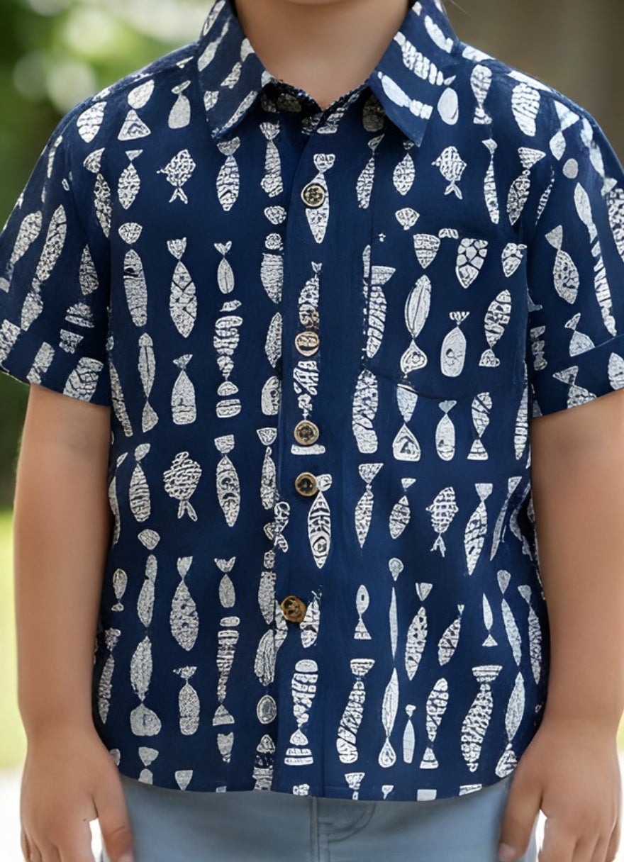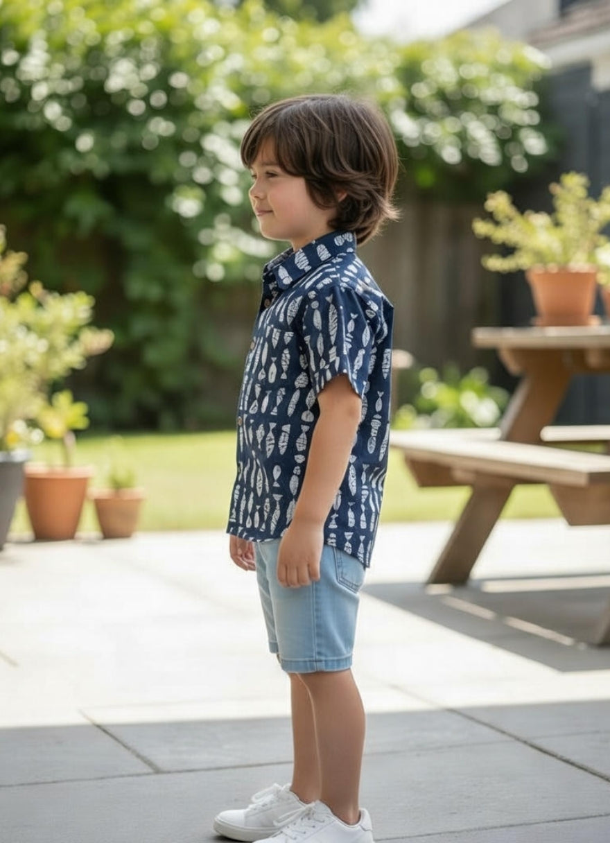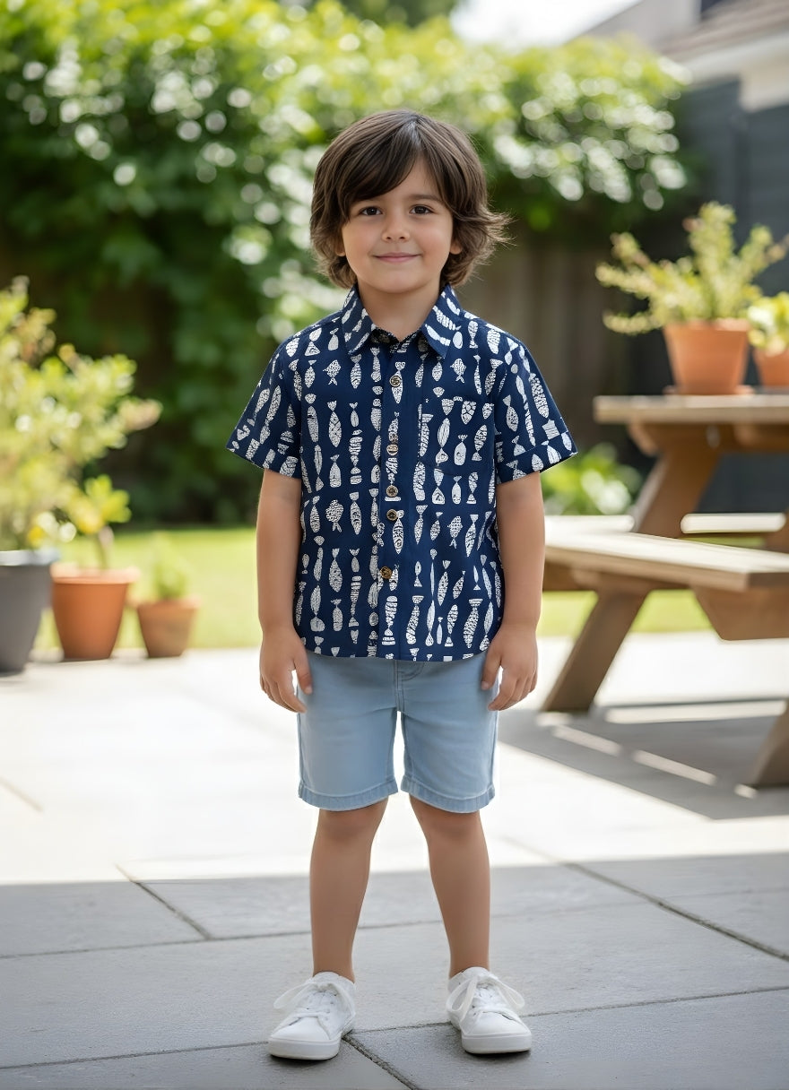 Add a fun and playful touch to your child’s wardrobe with this blue and white fish print half sleeve shirt. Crafted from 100% pure cotton, it feels soft on the skin and allows breathability for all-day comfort. The cheerful animal (fish) print makes it perfect for kids, while the classic regular fit ensures ease of movement and a smart look. Ideal for casual outings, playdates, or everyday wear, this shirt keeps your little one stylish and comfortable.