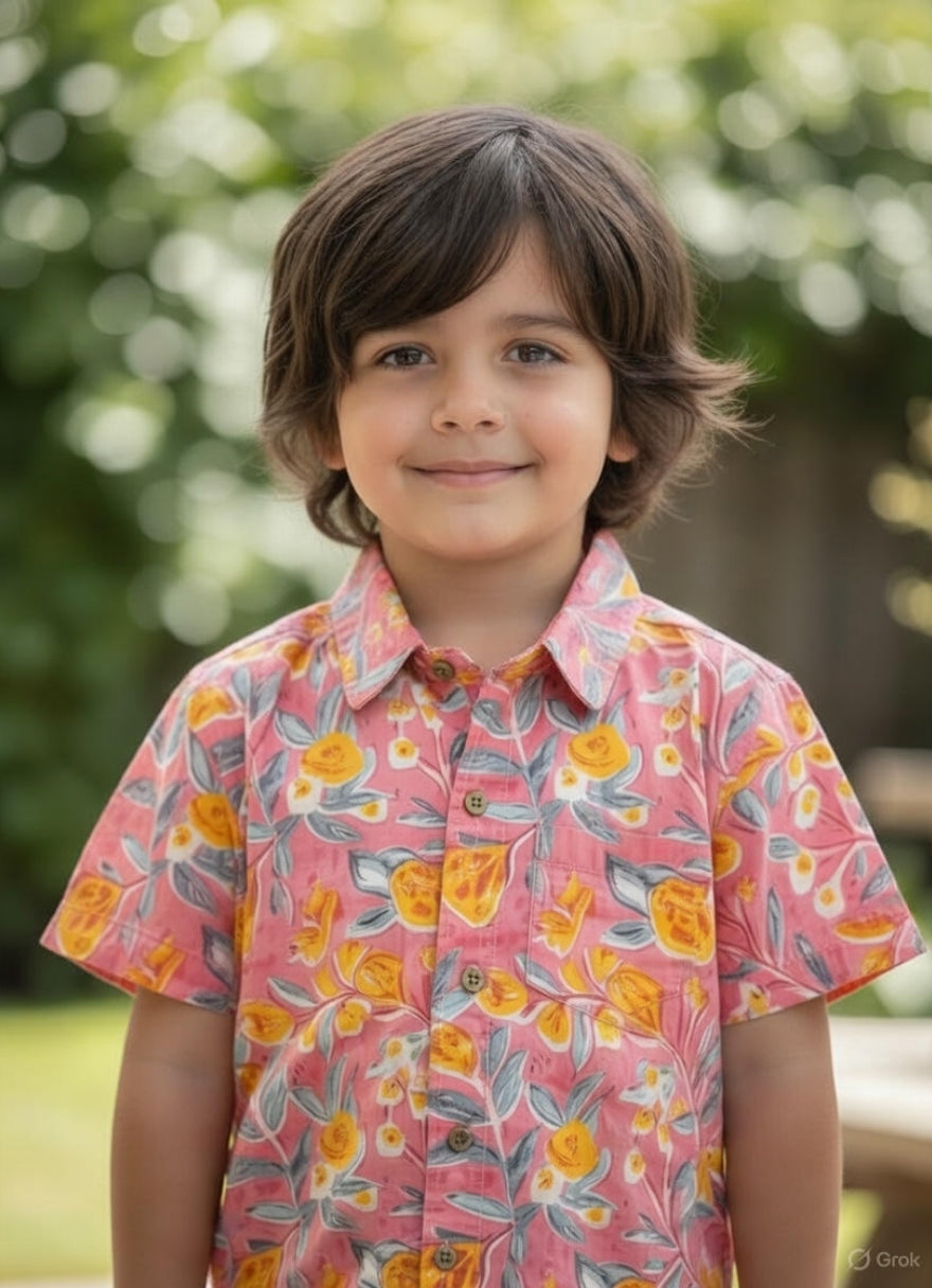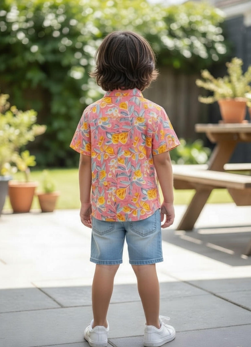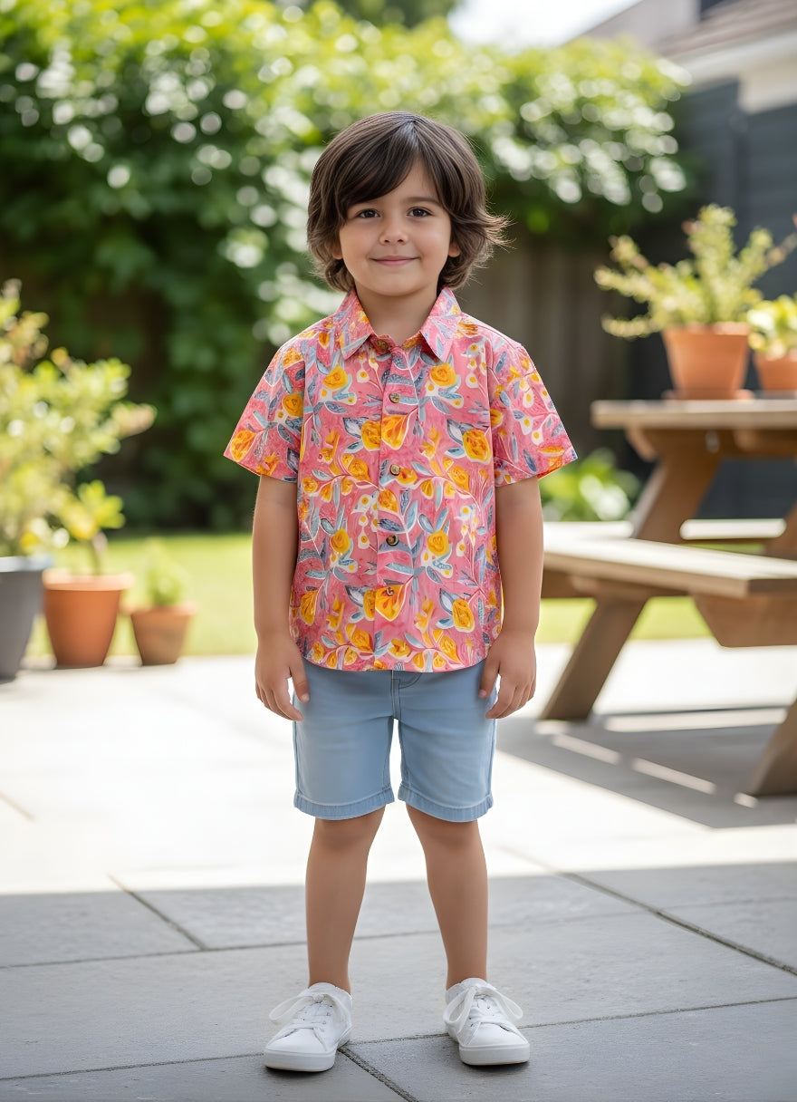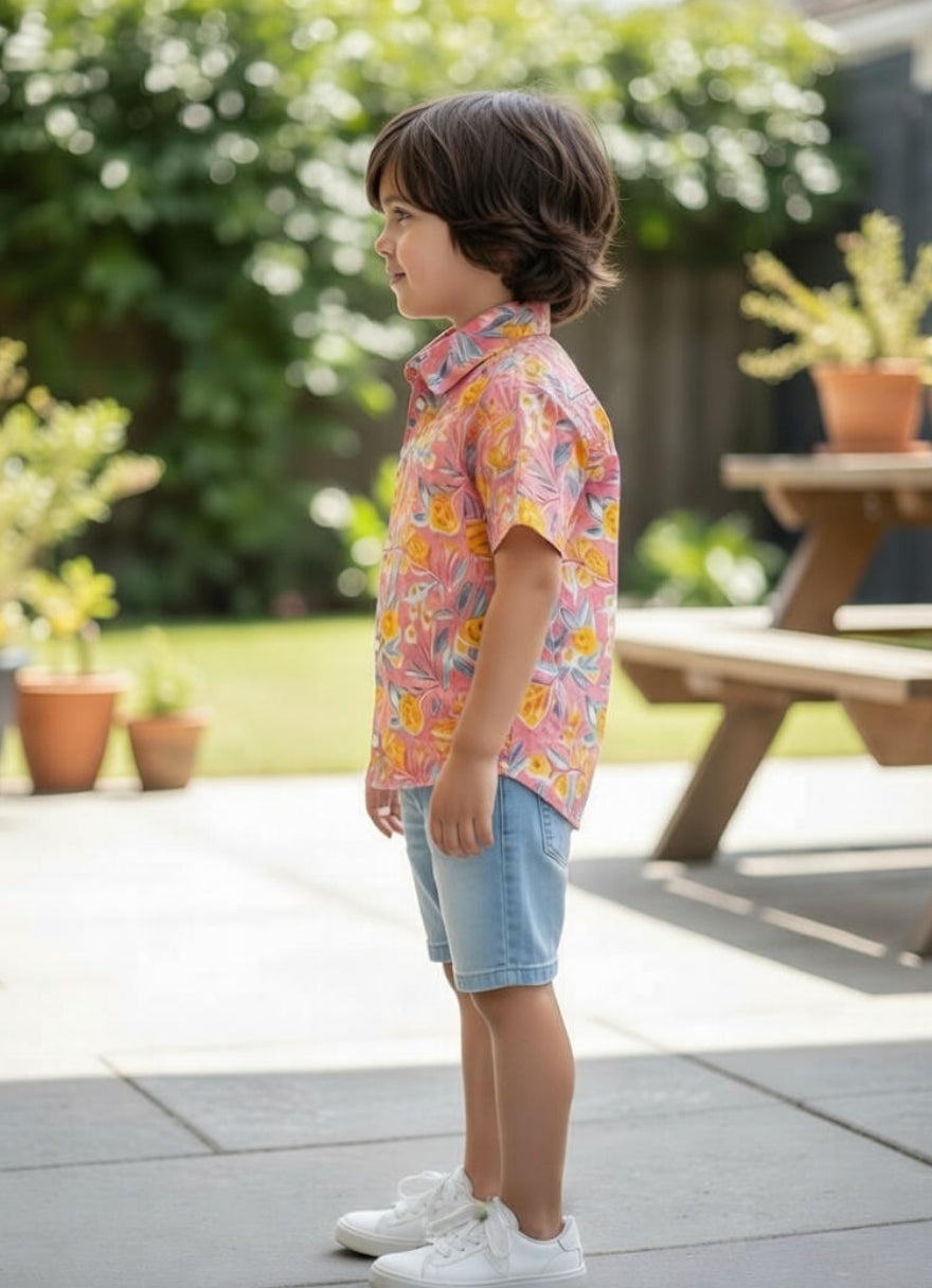 Add a fresh and cheerful touch to your child’s wardrobe with this peach floral print half sleeve shirt. Crafted from 100% pure cotton, it offers a soft, breathable feel that keeps kids comfortable all day long. The elegant floral print paired with a classic regular fit makes this shirt perfect for casual outings, family gatherings, or everyday wear. Stylish yet comfortable, it’s a great choice for a smart and playful look.