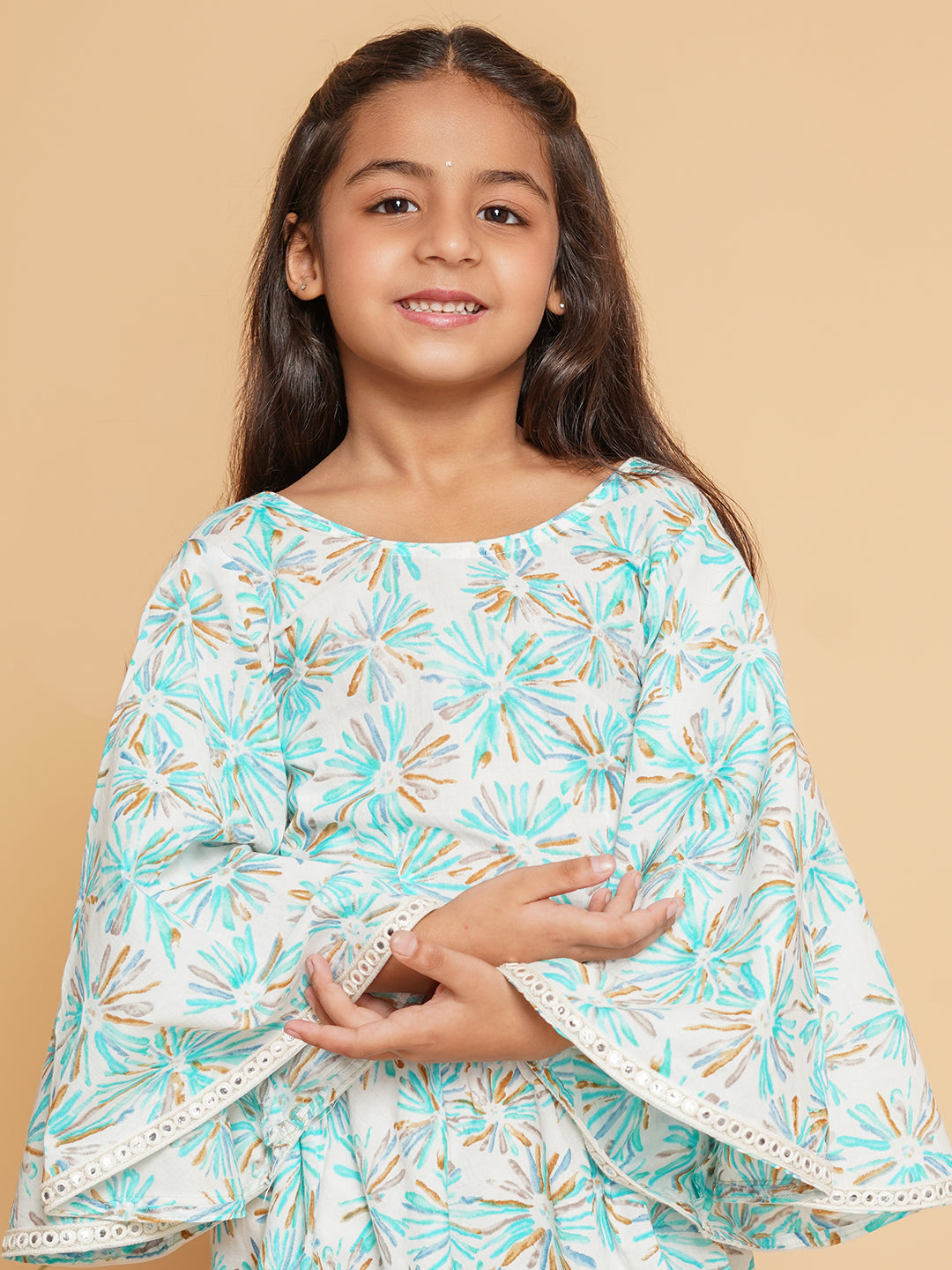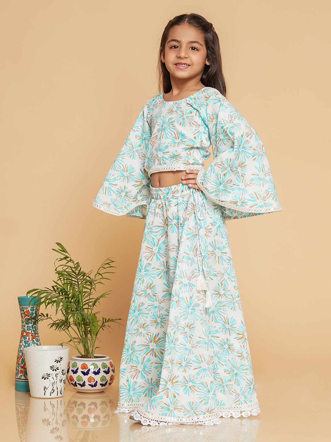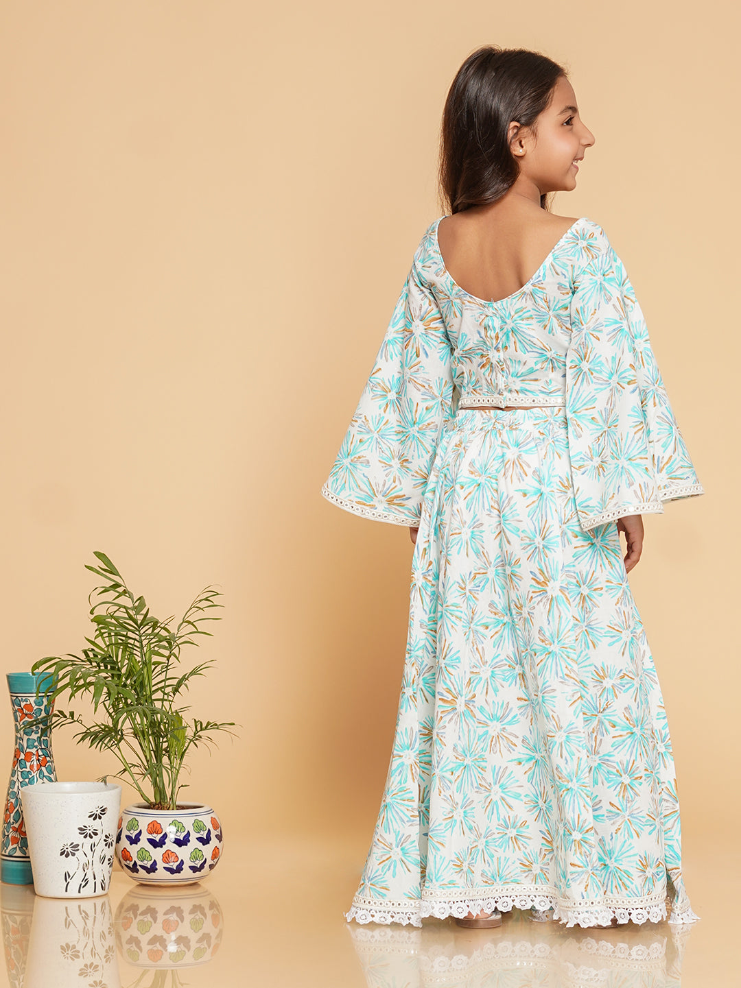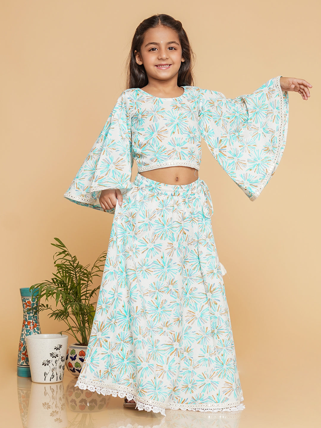 Unleash your playful side with this white and blue pastels crop top and skirt set! Made of organic cotton, this set includes a blouse with bell sleeves and a skirt with a pretty border. Perfect for a day wedding, this ethnic coord set exudes charm and femininity.